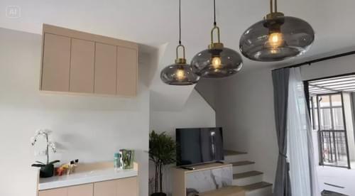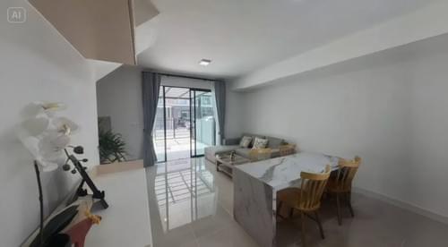 This 120 sqm, fully furnished two-story townhouse in the Pleno Sukhumvit – Bangna project offers three bedrooms and two bathrooms designed for comfort, style, and practicality. The open-plan living area features a light color palette, modern pendant lighting, a large flat-screen TV, and versatile under-stair storage. The sectional sofa with accent pillows creates a welcoming and relaxed atmosphere for family life or entertaining guests.