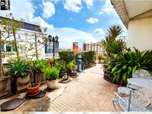 Upstairs, the third floor hosts two spacious bedrooms with a shared bathroom, while the entire fourth floor is dedicated to a private master suite. This top level includes an ensuite bathroom and direct access to a rooftop terrace garden, creating a peaceful retreat above the city.