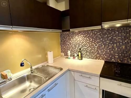 The kitchen is compact yet efficient, fitted with modern cabinetry, a mosaic tile backsplash, and stainless-steel sink — designed for ease of daily use. The bedroom features wooden flooring, a comfortable double bed, built-in cabinetry, and large mirrored wardrobes that maximise storage while keeping the room feeling open. A work desk and generous windows complete a layout that supports both rest and productivity.