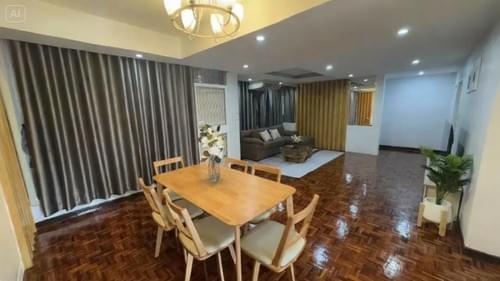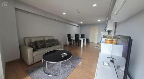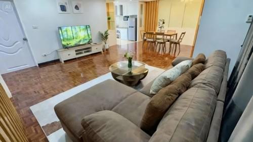 This 106 sqm, fully furnished 3-bedroom, 2-bathroom condo is located on the 8th floor of Siam Condominium, offering a perfect combination of style, functionality, and comfort. The open-concept living and dining area features wood parquet flooring, a modern sofa, and a chic dining table with chandelier lighting. Large windows fill the space with natural light, creating an airy, welcoming ambiance perfect for relaxing or entertaining.