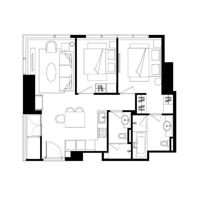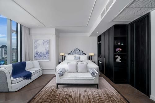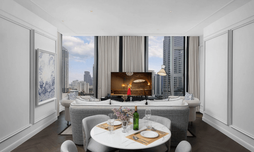 Designed for couples with children seeking more spacious accommodations for extended stays, our Two-Bedroom Suite Apartments are accented with design elements inspired by both Thai and French heritage, offering sweeping city views.