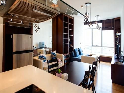 Set high on the 18th floor of the iconic Baan Sathorn Chaopraya, this generously sized 74.5 sqm one-bedroom residence offers refined riverfront living in the heart of Khlong San. Fully furnished and thoughtfully designed, the unit features a flowing open-plan layout that seamlessly connects the living, dining, and kitchen areas into one elegant, light-filled space.