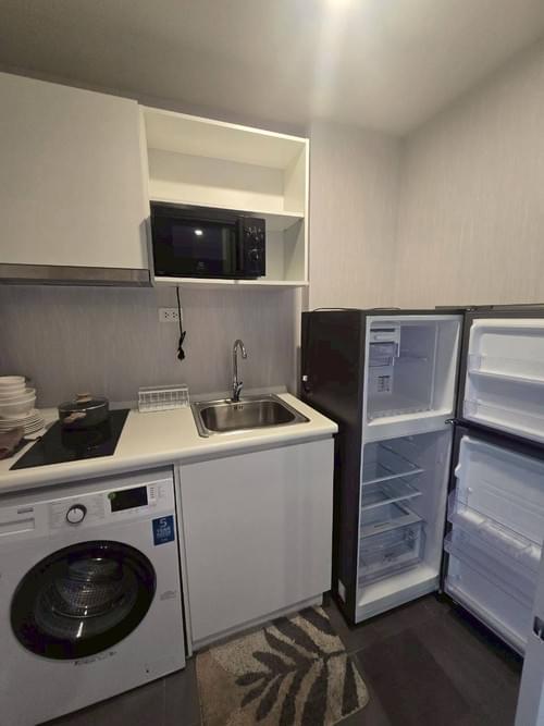 The condo is fully furnished and fully equipped, ready for immediate occupancy. The living area is compact yet efficient, furnished with a sofa, dining table with chairs, TV console, and air-conditioning. The built-in kitchen includes an electric stove, microwave, refrigerator, washing machine, and generous cabinetry, ensuring functionality without clutter.